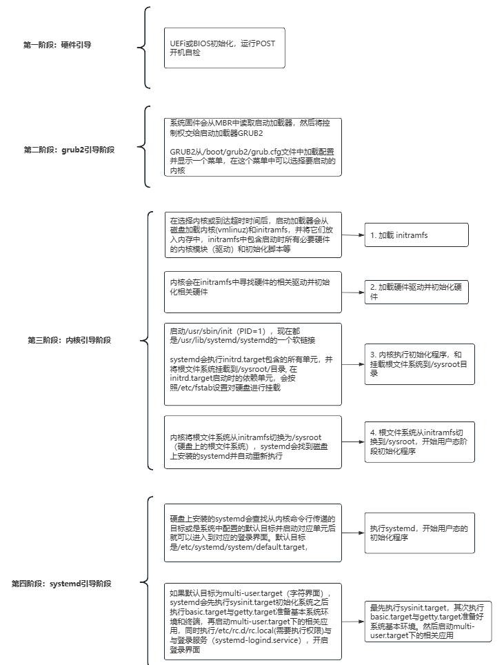 系统固件会从MBR中读取启动加载器,然后将控制权交给启动加载器GRUB2,GRUB2从/boot/grub2/grub.cfg文件中加载配置并显示一个菜单,在这个菜单中可以选择要启动的内核。3:内核引导阶段