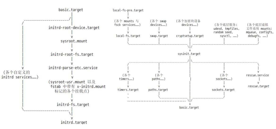2. 最先执行sysinit.target,其次执行basic.target与getty.target准备好系统基本环境。然后启动multi-user.target下的相关应用。